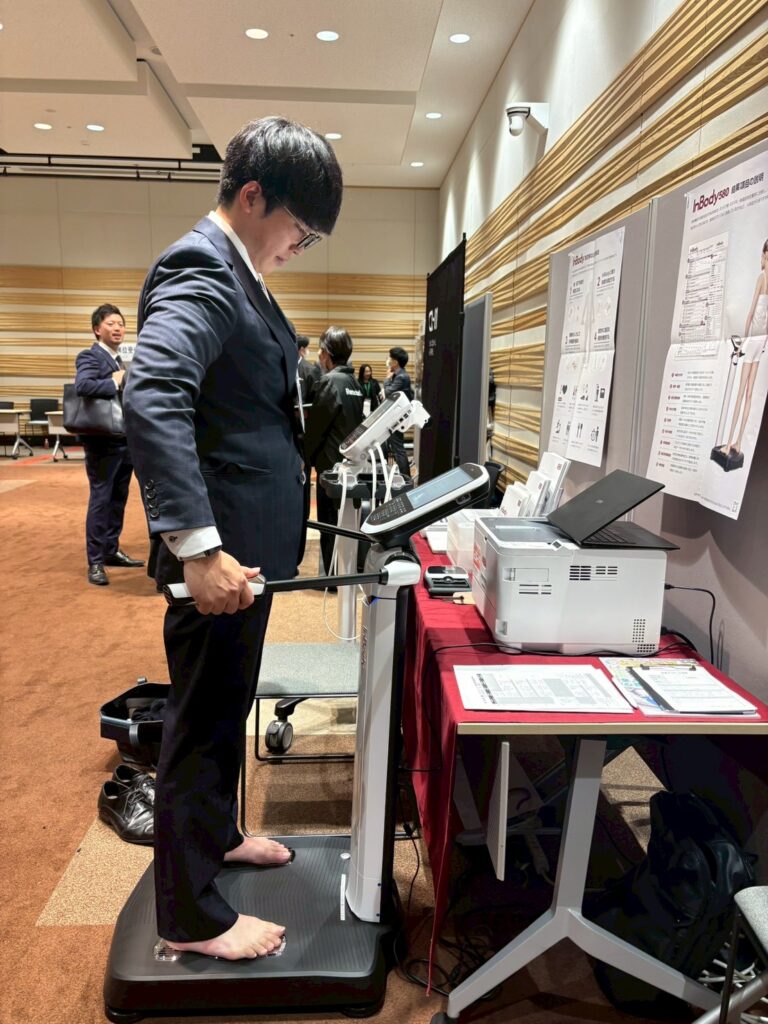 企業展示ブースも設置されておりました。妹尾先生は昨年に続き体組成計のデモを敢行。